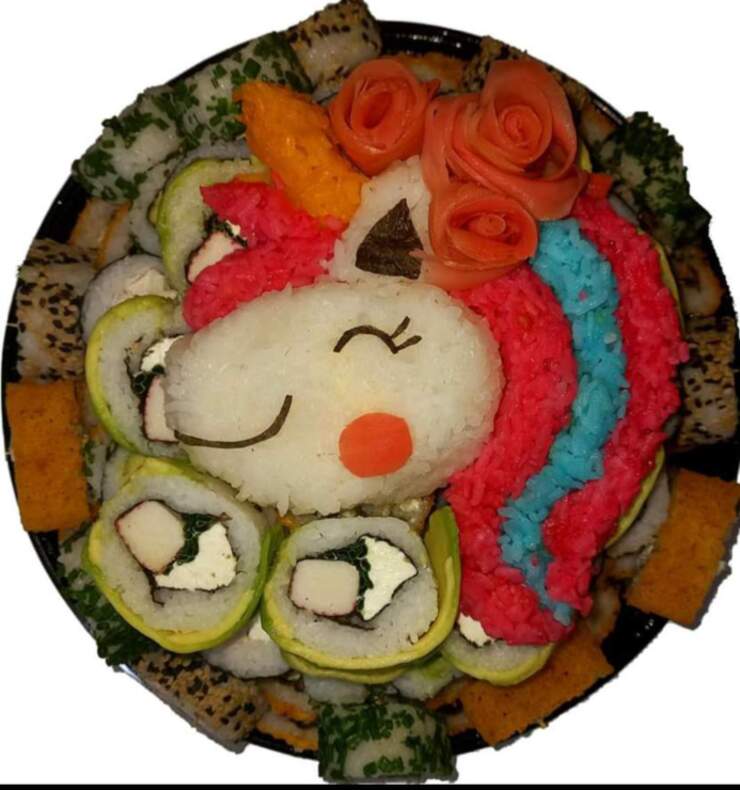torta con bento de unicornio relleno de pollo queso y 100 pzs mixtas de sushi 50 fritas 50 frias rellenos a tu estilo no entra salmon en la oferta